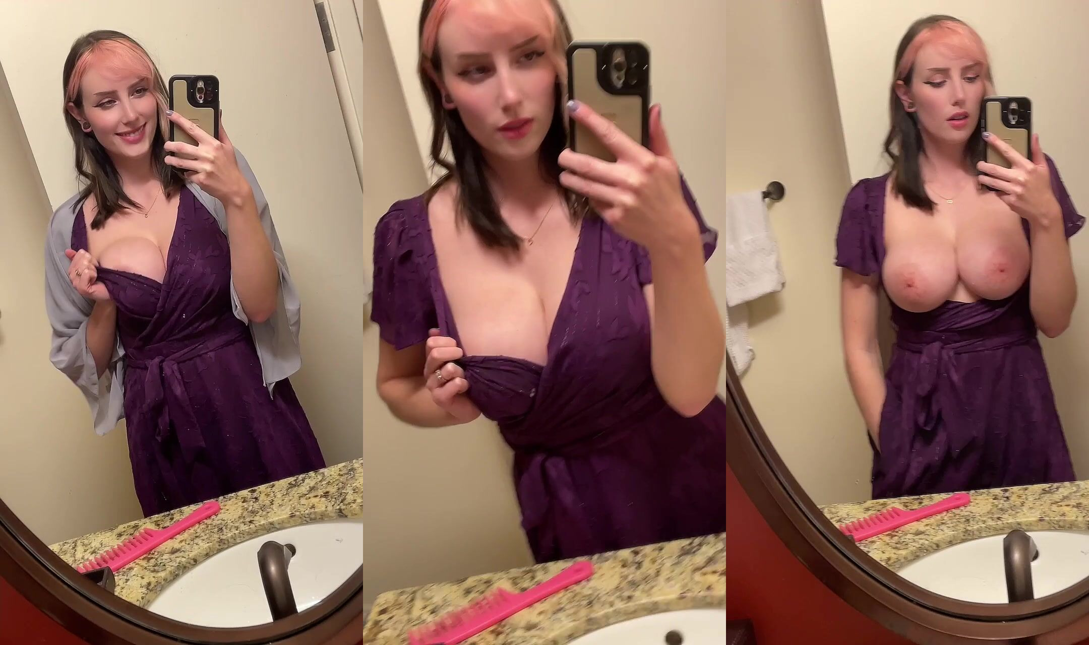 This seductive video features Morgpie posing in a purple dress teasing her tits in a bathroom setting.
