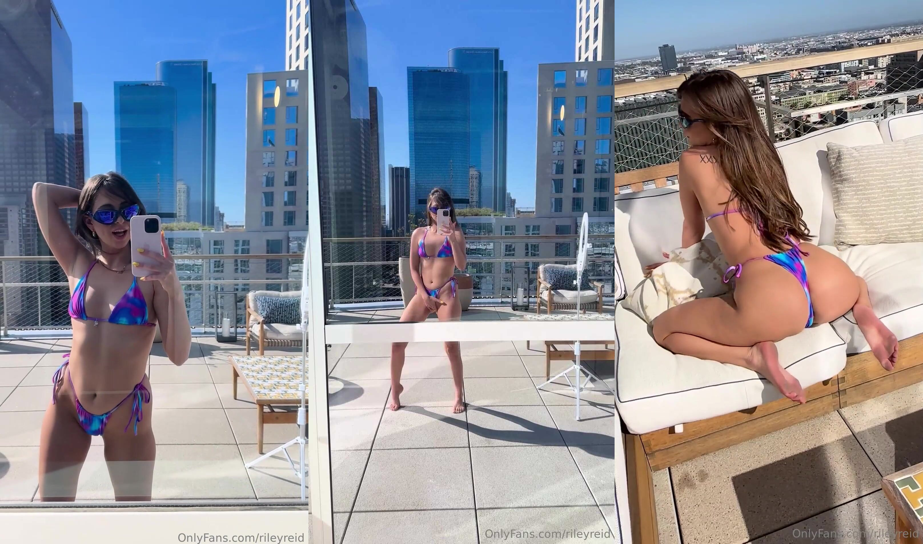 Riley Reid teases in a skimpy bikini, showing off her perfect curves and juicy ass on a sunny rooftop in this seductive OnlyFans video.
