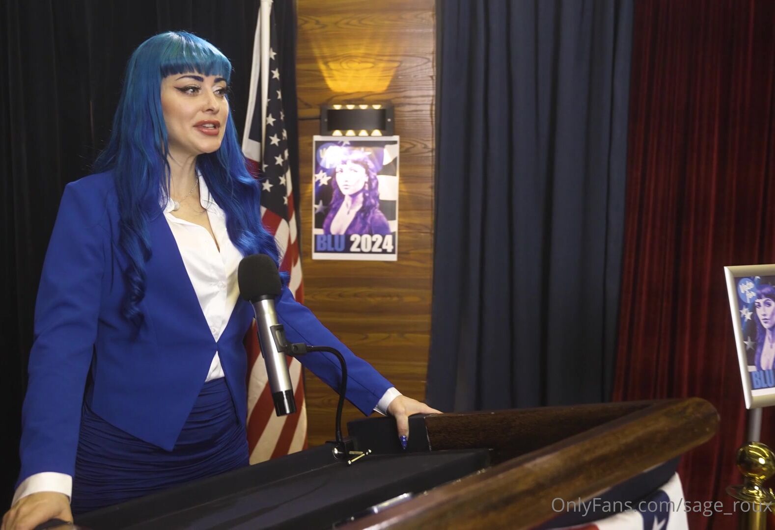 Blue-haired OnlyFans sensation jewelzblu stars in a steamy political-themed video, starting with a tease in a tight blue suit before stripping down to give a sloppy blowjob and riding cock in a wild session.