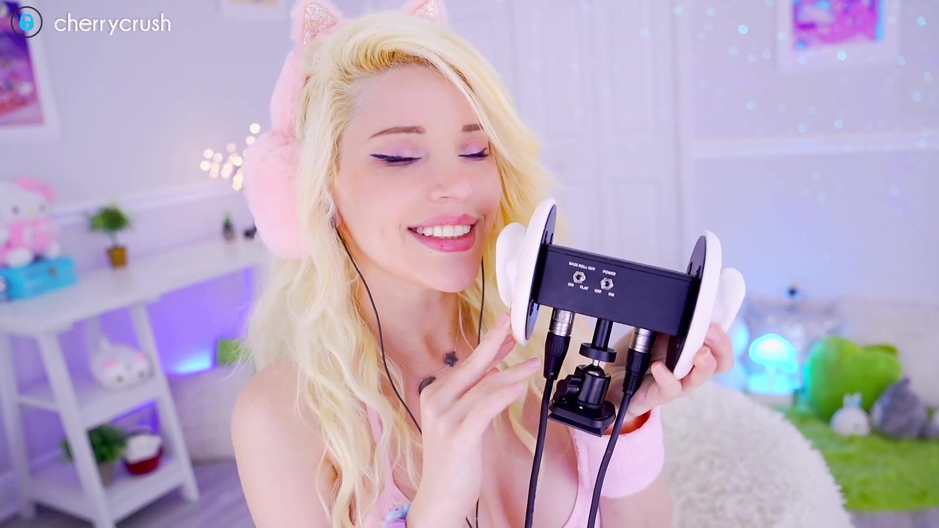 Blonde babe Cherrycrush brings you into her whimsical world with ASMR sounds and playing in cute pink lingerie and kitty ears.