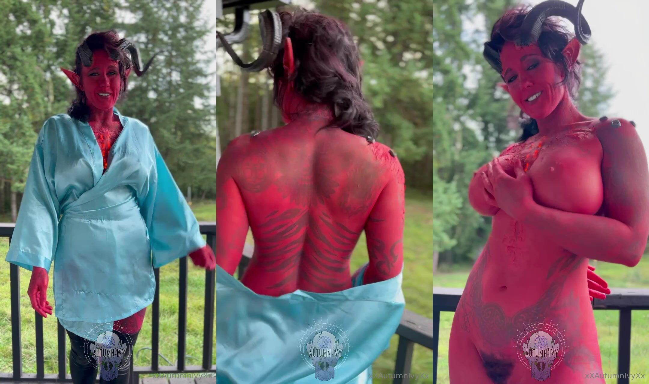 AutumnIvyXXX rocks a devil costume in this steamy outdoor cosplay video, flaunting her curvy body and teasing with her juicy boobs as she embraces her kinky side.