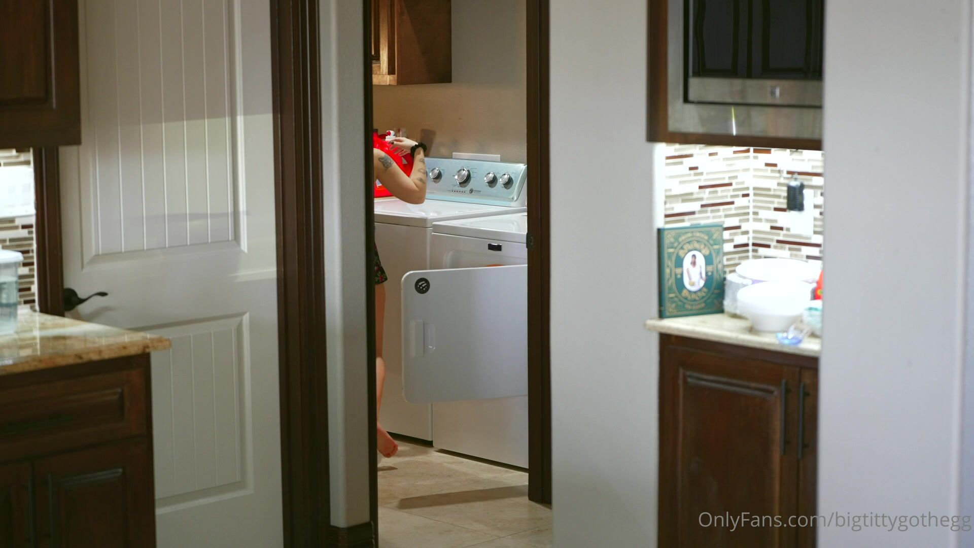BigTittyGotHegg strips down to lingerie and shows off her big tits in this seductive laundry room video from OnlyFans.