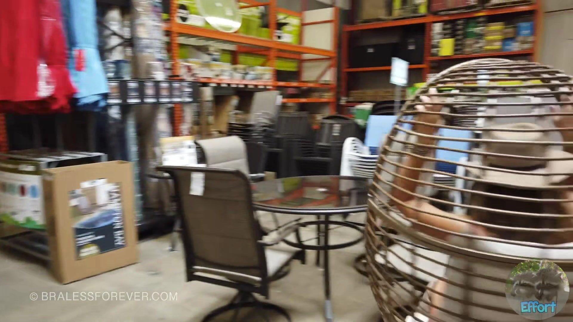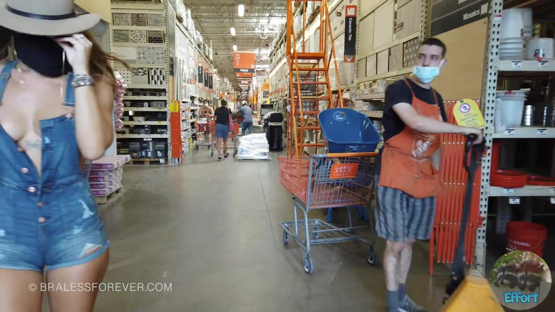 BralessForever goes braless in a public shopping trip to Home Depot. She boldly walks through the store with a skimpy outfit, showing off her tits in a daring video.