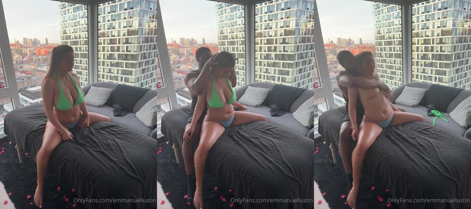 Curvy Ebony goddess Emmanuellustin teases in a green bikini, flaunting her thick thighs and big booty in a luxurious setting with a city skyline view.