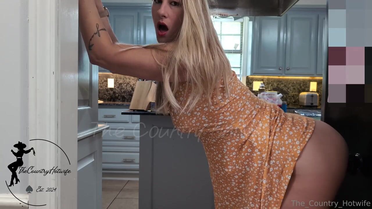 Blonde bombshell The_Country_Hotwife teases in an orange dress while pleasuring herself with a black dildo in this steamy kitchen video.