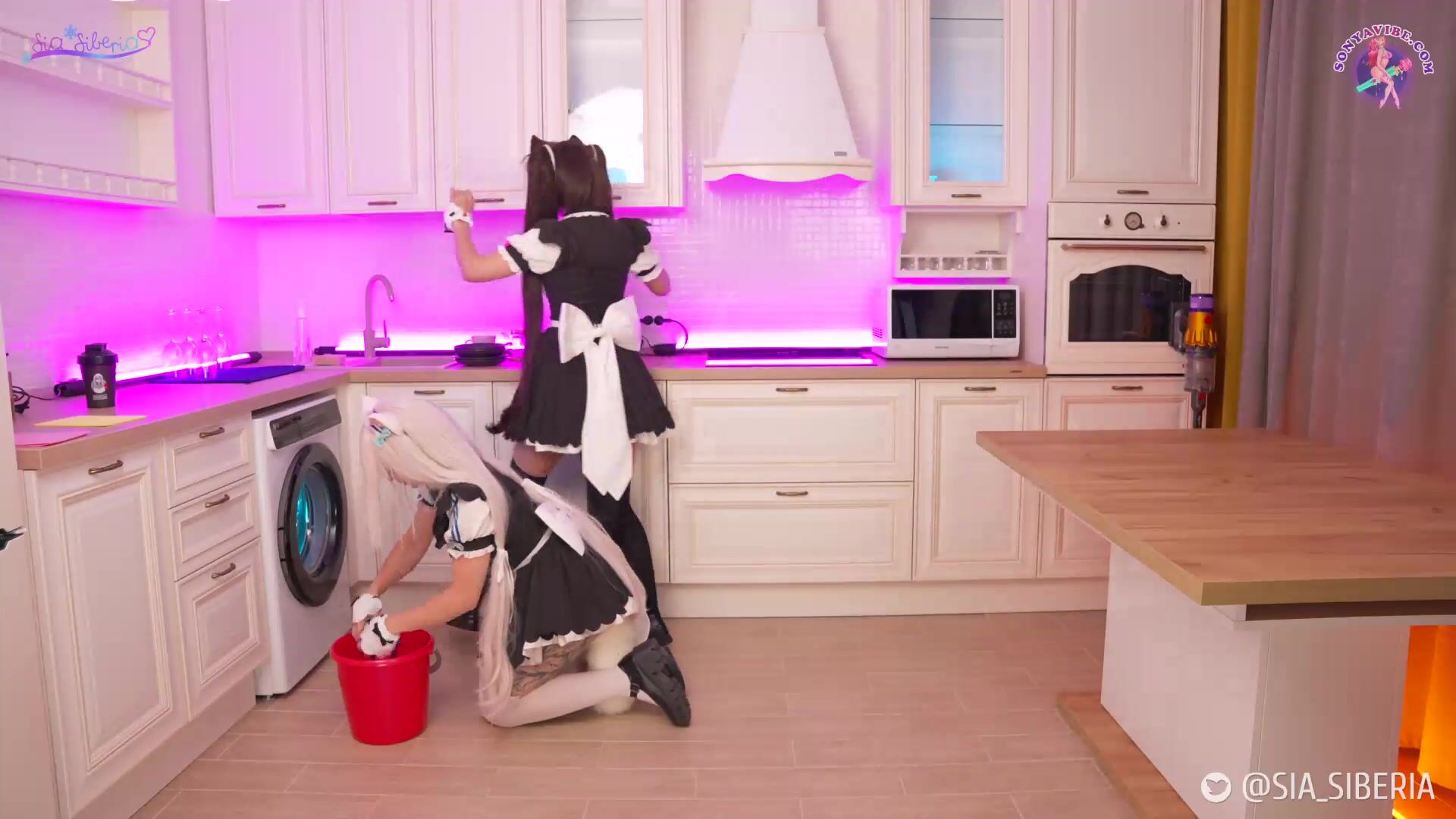 Sia Siberia and Sonya Vibe get naughty in cosplay as they tease in a wet and messy maid cleaning video